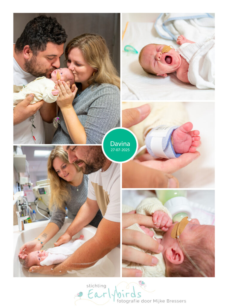 Op 27 juli 2025 lag ik opnieuw uren aan het CTG, omdat deze niet variabel genoeg was. Er werd een echo gemaakt en ook daarop was achteruitgang te zien. Om 17:30 uur kreeg ik uiteindelijk te horen dat ze een keizersnede gingen uitvoeren en om 18:27 uur werd de kleine Davina geboren met 32 weken. Ze woog slechts 1270 gram en werd opgenomen op de intensive care neonatologie in Erasmus. De kleine meid had kleine voetjes, maar ze maakte grote stappen. Al snel mocht de flow van haar neusbril gefaseerd worden afgebouwd en begon ze goed te groeien.
